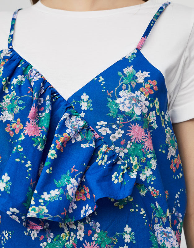 This dress provides just enough color to hint warmer temperatures while remaining universally seasonless. Beautifully printed flora throughout. Completely handmade, stitched, and embroidered. A natural, loose silhouette. Slim straps, and hits just below the knee in length. Sweet ruffled hem. Pero. Color Floral. 100% Cotton. Made in India. Lana is wearing a size 36.